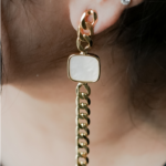 These stylish earrings feature a bold gold-tone chain drop design, accented with a sleek white square stud. The White Fringe Drop is a combination of polished metal and the deep black detail creates a chic, modern look with an edgy touch.