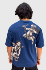 Xequeil cherubic eerie face navy blue gothic-style T-shirt featuring a devilish cherub with horns aiming a flaming arrow and a winged angel holding a skull, creating a contrast between innocence and darkness in a unique streetwear design.