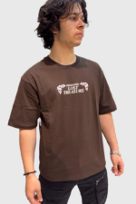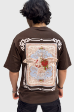Xequeil ornate vintage print .This dark brown oversized T-shirt features an ornate back graphic with a vintage-inspired frame. Inside, the design showcases an eagle with outstretched wings, clutching a red rose, with the words “PURE BEAUTÉ” and “LOST TREASURE” in elegant typography. The combination of intricate detailing and classic motifs gives this T-shirt a stylish and artistic streetwear appeal.