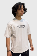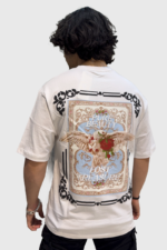 Xequeil ornate vintage print. This white oversized T-shirt features an intricate back design framed with ornate patterns. At the center, an eagle with open wings clutches a red rose, with the words “PURE BEAUTÉ” and “LOST TREASURE” elegantly displayed. The vintage-inspired artwork, combined with the modern streetwear fit, makes for a bold and stylish statement piece.